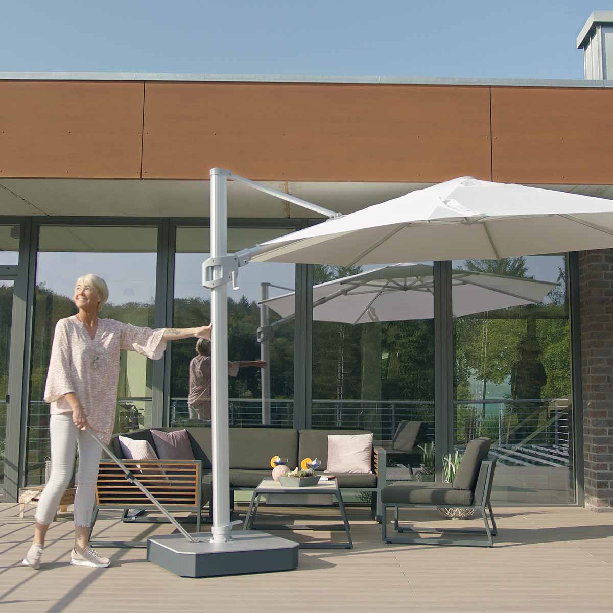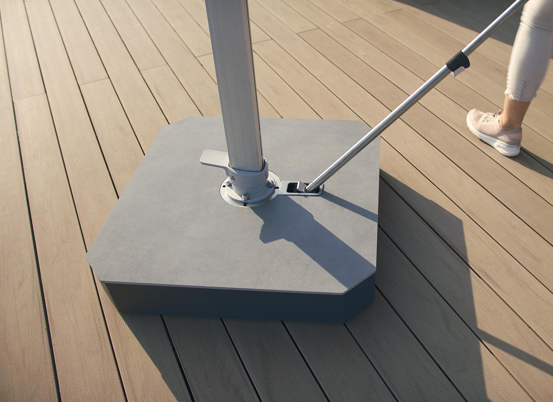 Zur leichteren Bewegung sind die Gelenkrollen kugelgelagert ausgeführt. Die stabilen und robusten Abdeckplatten des Ständers ermöglichen eine Begehbarkeit zur Bedienung des Sonnenschirmes.